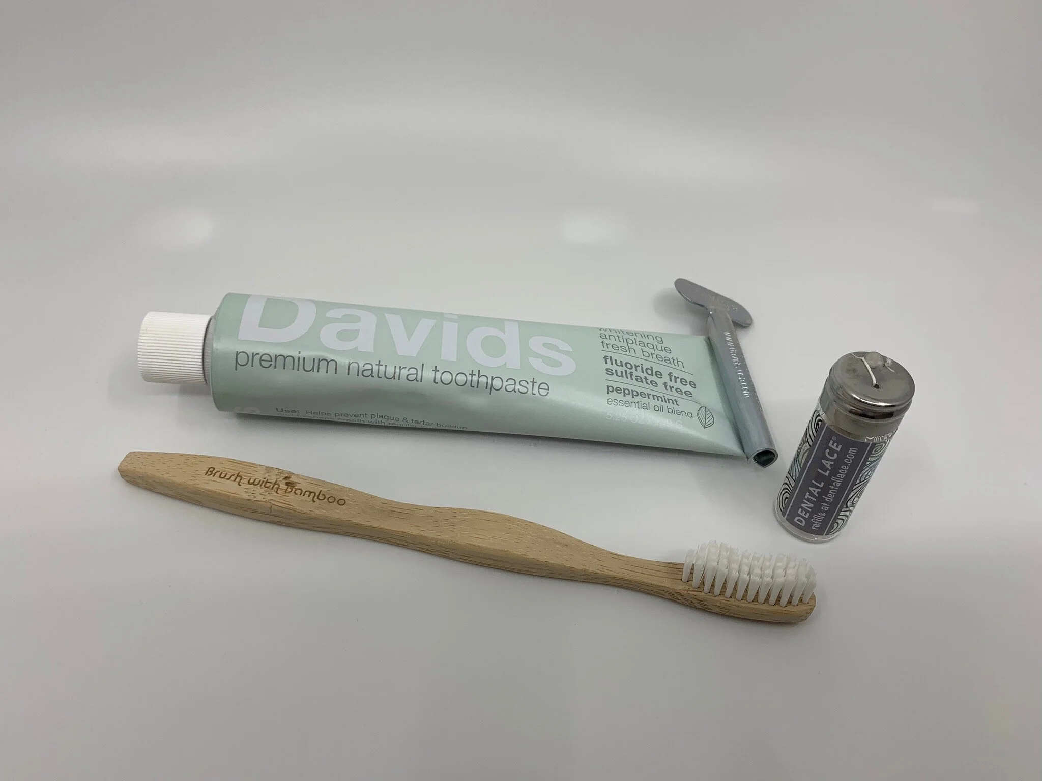 Steel-tubed toothpaste, a bamboo toothbrush and glass dental floss in a glass container all represent alternatives to traditional plastic options.