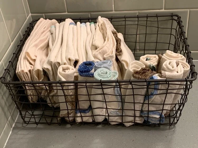 To limit the need for paper towel, when safe, reusable options, such as reusable cloths, can be placed in areas where disposables are most common ( in bathrooms and kitchens, for example ). By leaving these reusables in convenient locations, paper towel can be saved for only essential tasks. These containers of clean cloths can be washed and replenished as required ( pictured ); as a result, obtaining paper towel frequently from a store is not necessary.